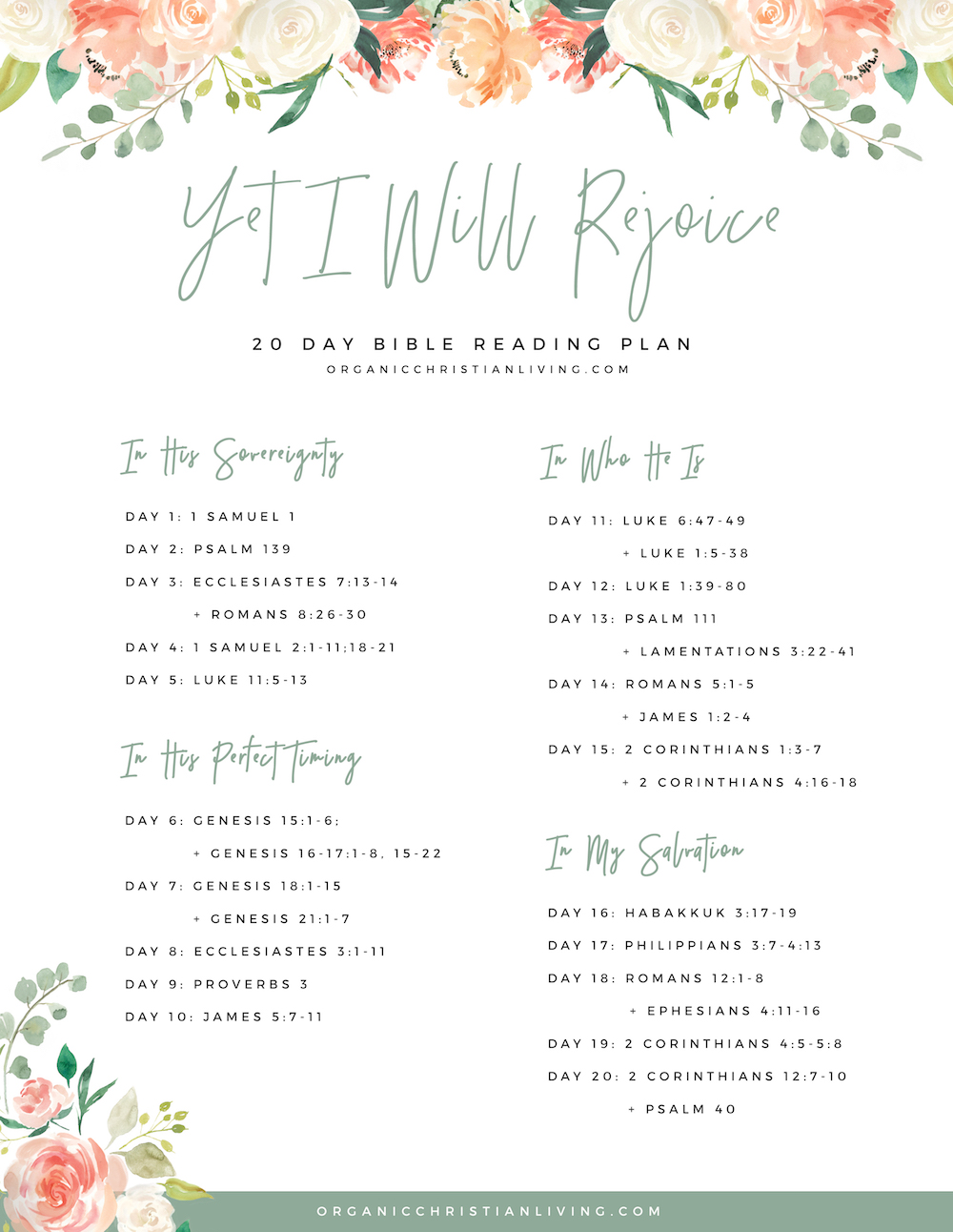 - Below the Yet I Will Rejoice Bible Reading Plan printout, you’ll find summaries of all four sections of the reading plan: Yet I Will Rejoice In His Sovereignty, Yet I Will Rejoice In His Perfect Timing, Yet I Will Rejoice In Who He Is, and Yet I Will Rejoice In My Salvation. Although you’re free to read all four summaries at once, I recommend reading one section overview at a time before you begin reading that section’s Scriptures.